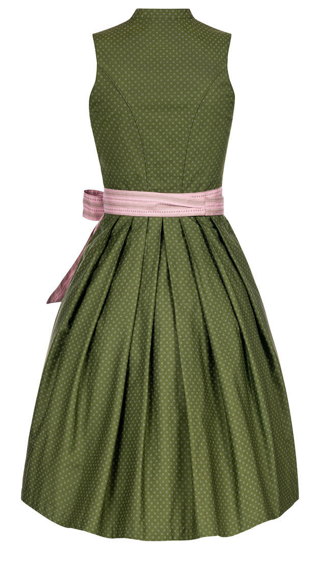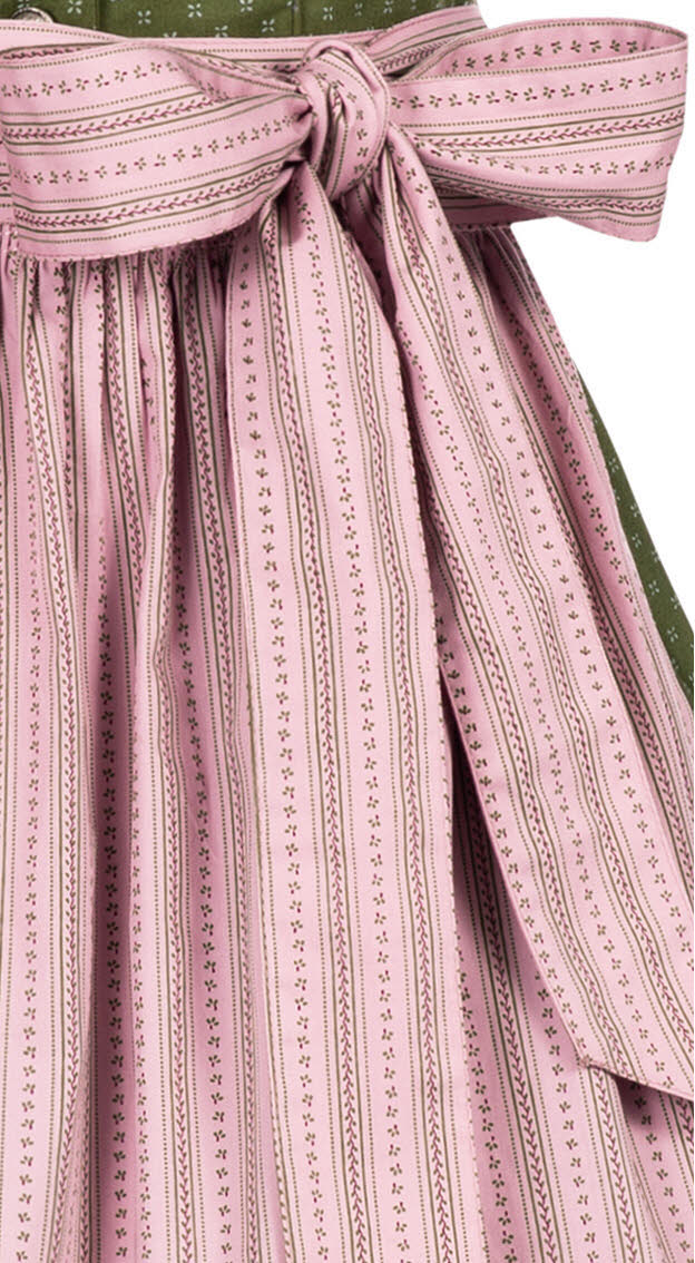 Das Midi-Dirndl Rita in Oliv ist ein echter Klassiker. Das Retro-Dirndl mit dem V-Ausschnitt ist in den Farben Oliv und Rosa. Das Mieder des Dirndls hat einen hochgeschlossenen Ausschnitt und die Abnäher sind abgepaspelt. Das mit kleinen Streublumen bedruckte Baumwollkleid wird vorne mit hübschen Metallknöpfen verschlossen. Auf der rechten Innenseite befindet sich eine Einschubtasche, in der mancherlei Kleinigkeiten aufbewahrt werden können. Die dazu passende Schürze in rosa hat grüne Ranken und Blütenköpfchen und rundet somit das Dirndl perfekt ab. Das Dirndl kann zu jedem Anlass getragen werden.