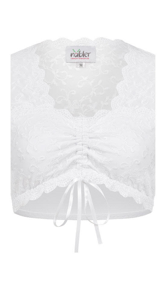 Eine wahrhaftige Verführung! Die Dirndlbluse Nena von Nübler ist sehr angenehm zu tragen. Die Vorderseite besteht komplett aus einer eleganten Spitze. Ab dem Brustbereich ist die Bluse mit einem Stretch-Stoff unterfüttert. Durch die Raffung am Ausschnitt kann die Bluse individuell an Ihre Wünsche angepasst werden. Das Rückenteil ist im oberen Drittel aus der gleichen Spitze, der untere Teil ist ebenfalls aus Stretch-Stoff. Die schönen angeschnittenen Ärmel geben dem Ganzen das gewisse Etwas.