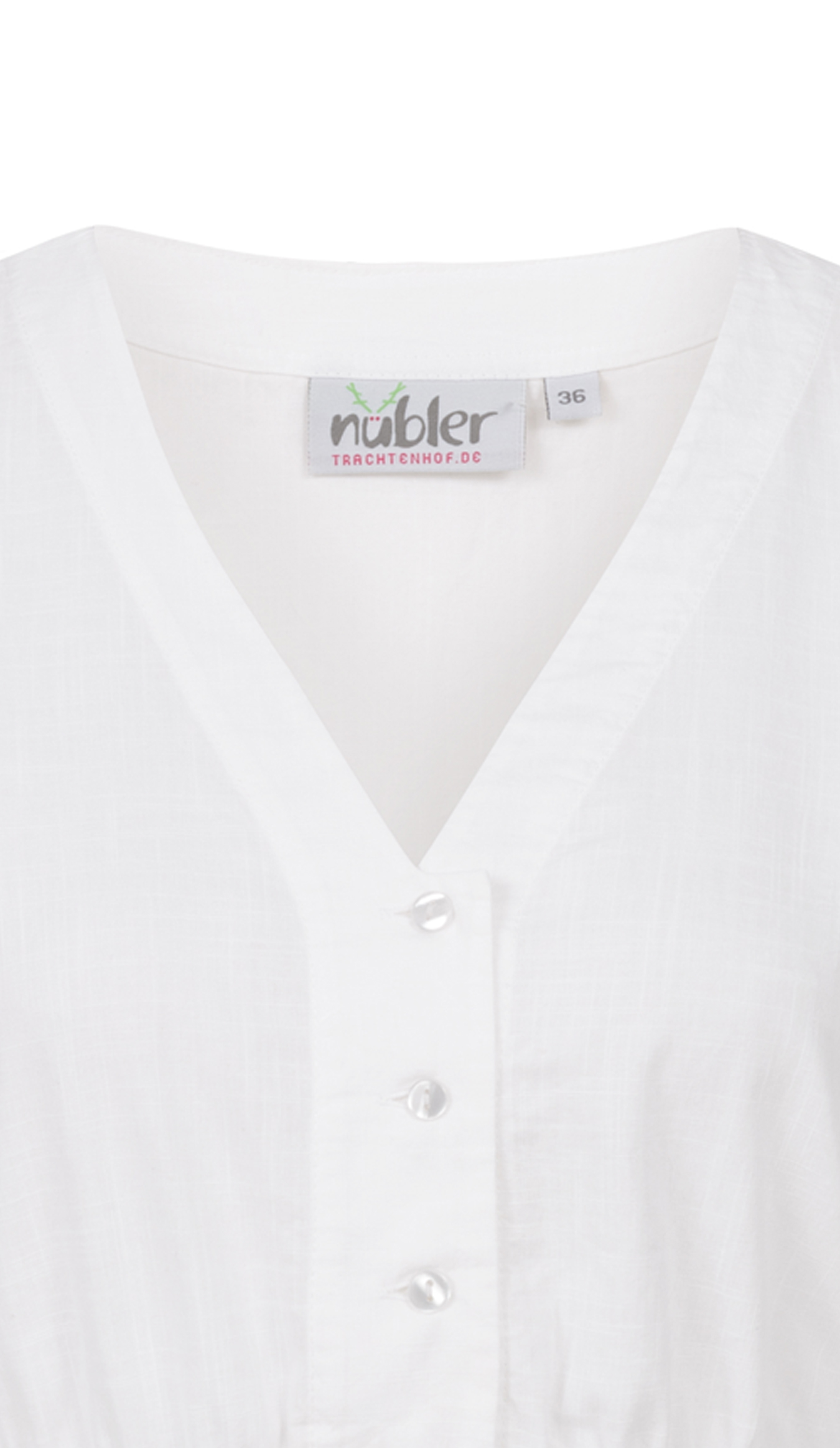 Unsere eindrucksvolle Dirndlbluse Langarm Vera in Weiß von Nübler ist einmalig. Der V-Ausschnitt gewährt hübsche Einblicke. Für den perfekten Sitz sorgen das eingearbeitete Gummiband am Blusenende und die Knöpfe zum Schließen an der Vorderseite. Diese Dirndlbluse verleiht Ihrem Dirndl den letzten Schliff und kann zu jedem Anlass, wie Hochzeit, Kommunion, Taufe, Firmung, Konfirmation, Familienfeier oder jedem anderen Fest getragen werden.