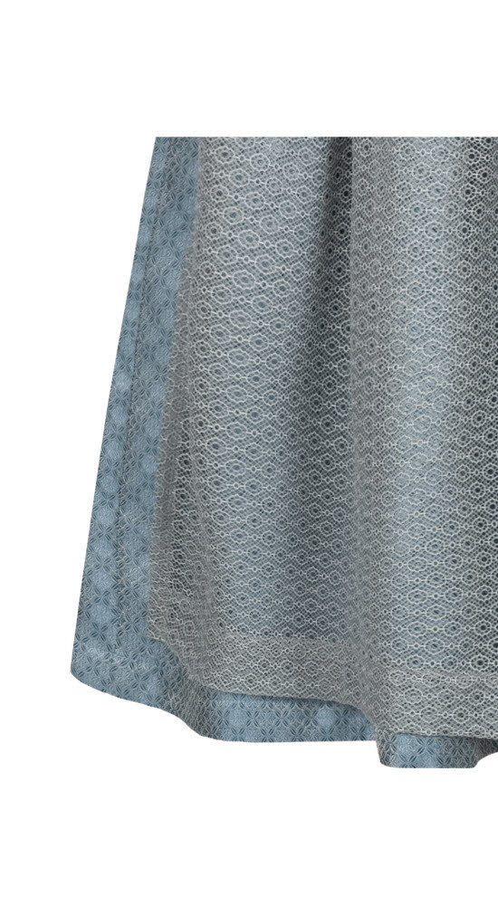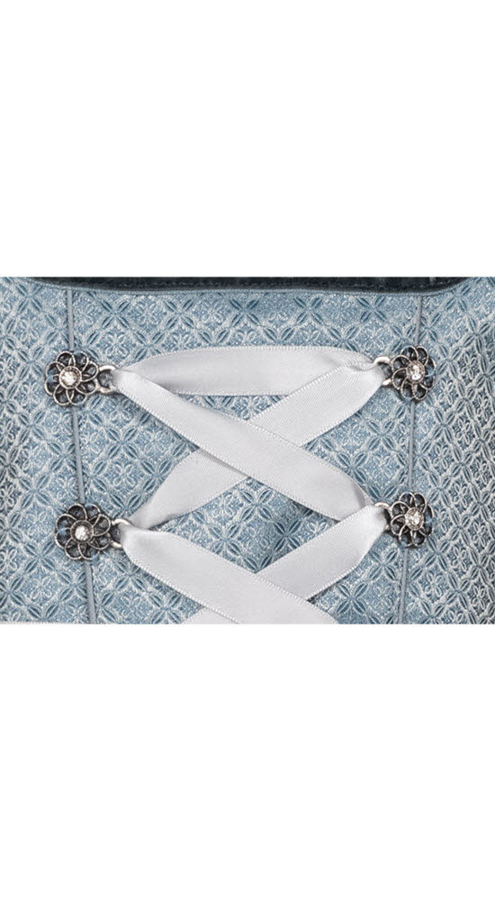 Der glanzvolle Samt-artige Dirndl Stoff ist mit einem Karo-Blumen-Muster überzogen. Um den eckigen Ausschnitt herum verläuft eine hübsche Froschmaulborte. Das hellblaue Satin-Miederband wird von hübschen Blümchenmiederösen gehalten, die wiederum mit dezenten Strasssteinen besetzt sind. Auf der Rückseite befindet sich der Reißverschluss.