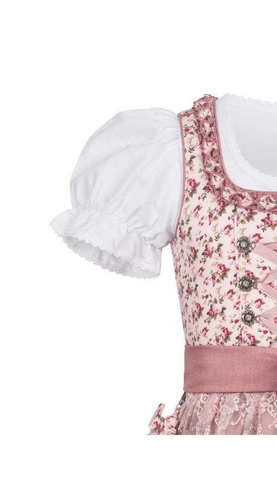 Abgerundet wird das Dirndl mit einer weißen Bluse. Der Blusenärmel ziert eine geraffte Borte. Verschlossen wird die Bluse mit dezenten Knöpfen auf der Vorderseite. Mit diesem Kinderdirndl wird die kleine Prinzessin garantiert zum Hingucker.