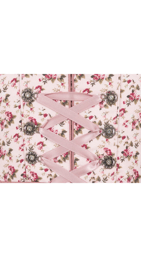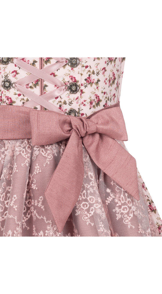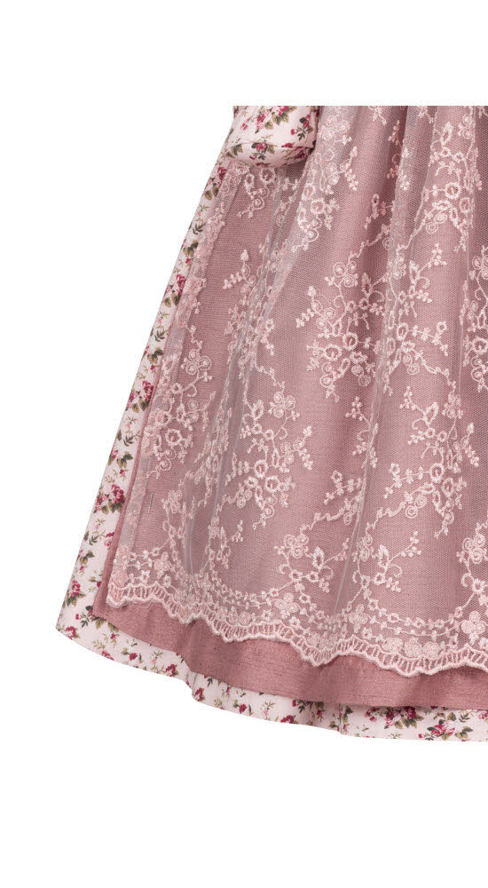 Die doppellagige Schürze ist definitiv das Highlight des Dirndls. Unterschürze und Schürzenband aus Satin in Rose schimmern dezent glänzend. Der obere Netzstoff in Rose bestickt mit wundervollen Blumenranken, lässt die Unterschürze durchschimmern. Der schöne Abschluss der Netzstoffschürze vollendet die wunderschöne Kombination.