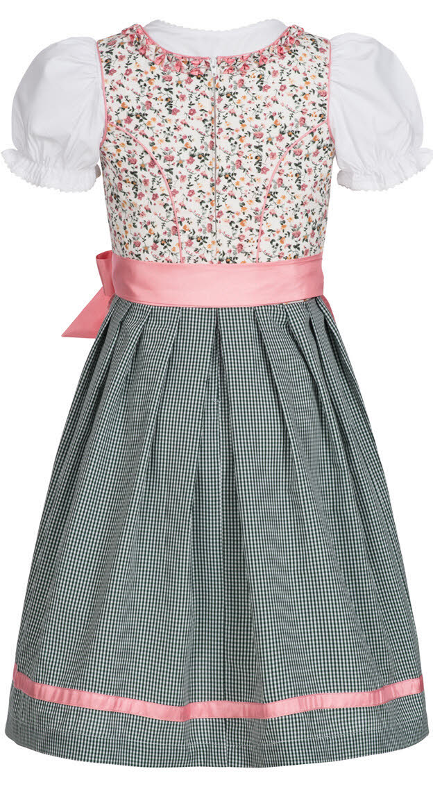 Das Kinderdirndl Nina in Weiß aus dem Hause Nübler, verwandelt jedes Mädchen zu einer wahren Prinzessin. Das Mieder ist vorne und hinten mit einem Blumenmuster versehen. Das Rosa Taftband wird von Blumenförmigen Miederhaken und Glitzersteinchen gehalten. Der Ausschnitt ist mit süßen Rüschen verziert. Die Schüre ist kariert in den Farben Grün und Weiß. Ein kleines Highlight ist das kleine Täschchen am Rock, in dem man super das Taschengeld verstauen kann. Die Schürze des Kinderdirndls Nina ist Rosaschimmernd. Die perfekt dazu passende Bluse ist am Ausschnitt und den Ärmeln mit einer kleinen Blumenborte besetzt. Mit diesem Dirndl wird das Mädchen garantiert zum Hingucker auf jeder Hochzeit, Kommunion, Taufe, Firmung, Konfirmation und Familienfeiern.
