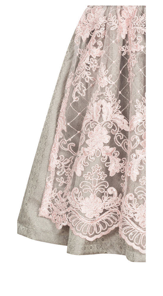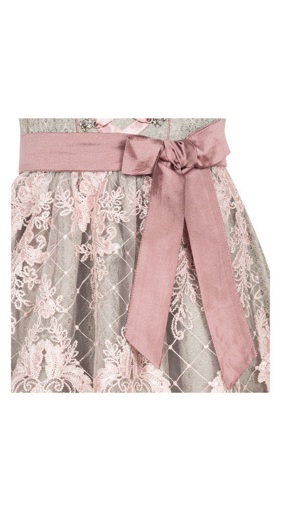 Die Dirndlschürze ist aus einem zarten rosa Netzstoff gefertigt und hat ein wunderschönes Blumenstickmuster mit dezent arrangierten Pailletten. Die Schürze verleiht dem Dirndl somit einen romantischen und verspielten Touch.