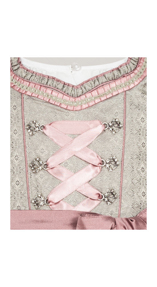 Das Dirndlkleid ist aus einem silbernen Jacquard Stoff mit barocken Ornamenten gemustert und hat einen herzförmigen Ausschnitt mit einer verschnörkelten zweifarbigen Borte. Das Mieder ist mit glitzernden Metallhaken zum Schnüren versehen, die mit Strasssteinen besetzt sind. Eine farblich passende Schleife ermöglicht die individuelle Bindung des Kleids. Der Reißverschluss befindet sich auf der Rückseite für ein Einfaches An- und Ausziehen.