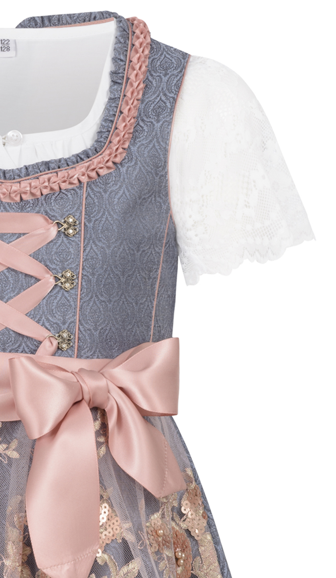 Verzaubern Sie Ihre kleine Prinzessin mit unserem traumhaften Kinderdirndl Gerhild in Rauchblau von Nübler, dass ideal für festliche Anlässe wie Hochzeiten, Geburtstage oder Volksfeste geeignet ist und Ihre Tochter begeistern wird. Das Kleid ist aus einem hochwertigen Material gefertigt, welches mit einem dezenten Blumenmuster verziert ist. Um den eckigen Ausschnitt und den Kragen herum verlaufen eine Posamenten-Borte und eine Froschmaul-Borte. Die Metall-Miederhaken zum Schnüren sind mit Glitzersteinen besetzt und werden durch ein farblich passendes Miederband ergänzt. Auch den Rocksaum schmücken zwei edle Borten. Auf der Rückseite befindet sich der Reißverschluss, um das An- und Ausziehen zu erleichtern. Die Dirndlschürze ist aus einem glanzvollen Netzstoff in Rosa gefertigt und hat ein florales Muster mit Pailletten und Perlen bestickt, das für einen Hauch von Glamour sorgt. Die Dirndlbluse hat perlmuttartige Verschlussknöpfe und Ärmel aus Spitze, die einen zauberhaften Look erzeugen. Der elastische Bund wiederum sorgt für einen optimalen Sitz und Tragekomfort. Mit diesem schicken Kinderdirndl liegen Sie immer richtig und verbinden stilsichere Mode mit Tradition.