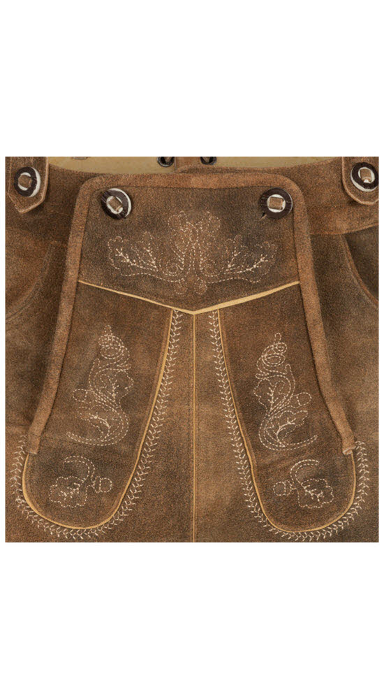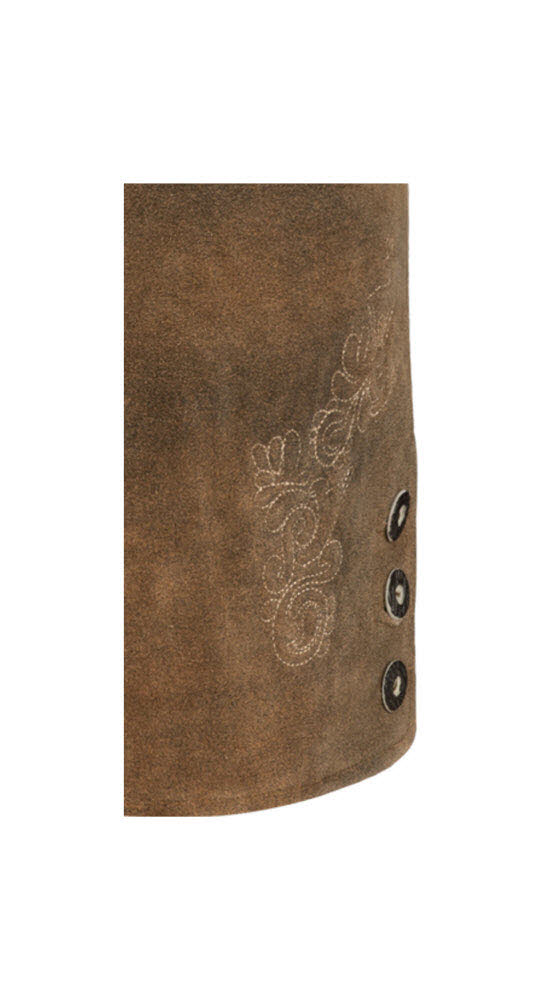 Dann ist diese Lederhose genau das Richtige für Sie! Diese kurze Herren Lederhose in Braun ist aus hochwertigem Leder gefertigt und mit aufwendigen Relief Stickereien verziert, die Eichenlaub abbilden. Eichenlaub steht für Stärke, Ausdauer und Treue - genau wie diese Lederhose! Die Lederhose hat einen klassischen Schnitt mit zwei Eingriffstaschen, einer Messertasche auf der rechten Seite und einer Gesäßtasche. Auf der Rückseite befindet sich eine Brotzeitfalte, die für mehr Bewegungsfreiheit sorgt. Der Latz auf der Vorderseite lässt sich mit Knöpfen in Hirschhorn Optik öffnen und schließen. Als Schmankerl sind die passenden Hosenträger dabei, die mit verstellbaren Metallschnallen dekorativ verziert sind. Die Hosenträger können Sie je nach Geschmack an- oder ablegen. Diese Lederhose ist ideal für Oktoberfest, Volksfeste oder andere Anlässe, bei denen Sie Ihre bayerische Tracht zeigen wollen. Sie können diese Lederhose mit einem Hemd, einem Janker oder einer Weste kombinieren und so Ihren individuellen Look kreieren.