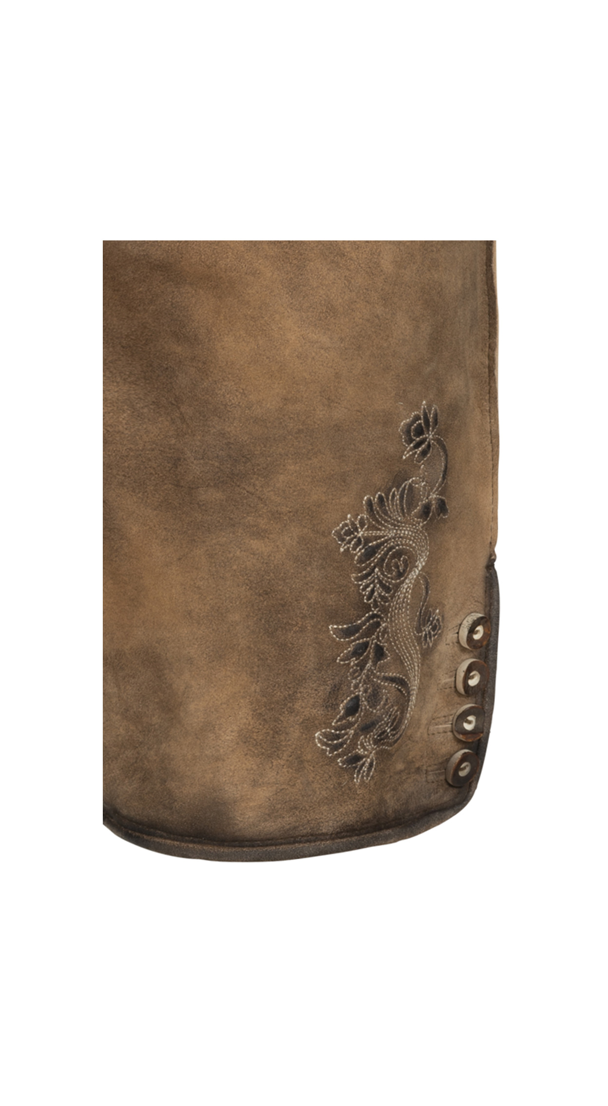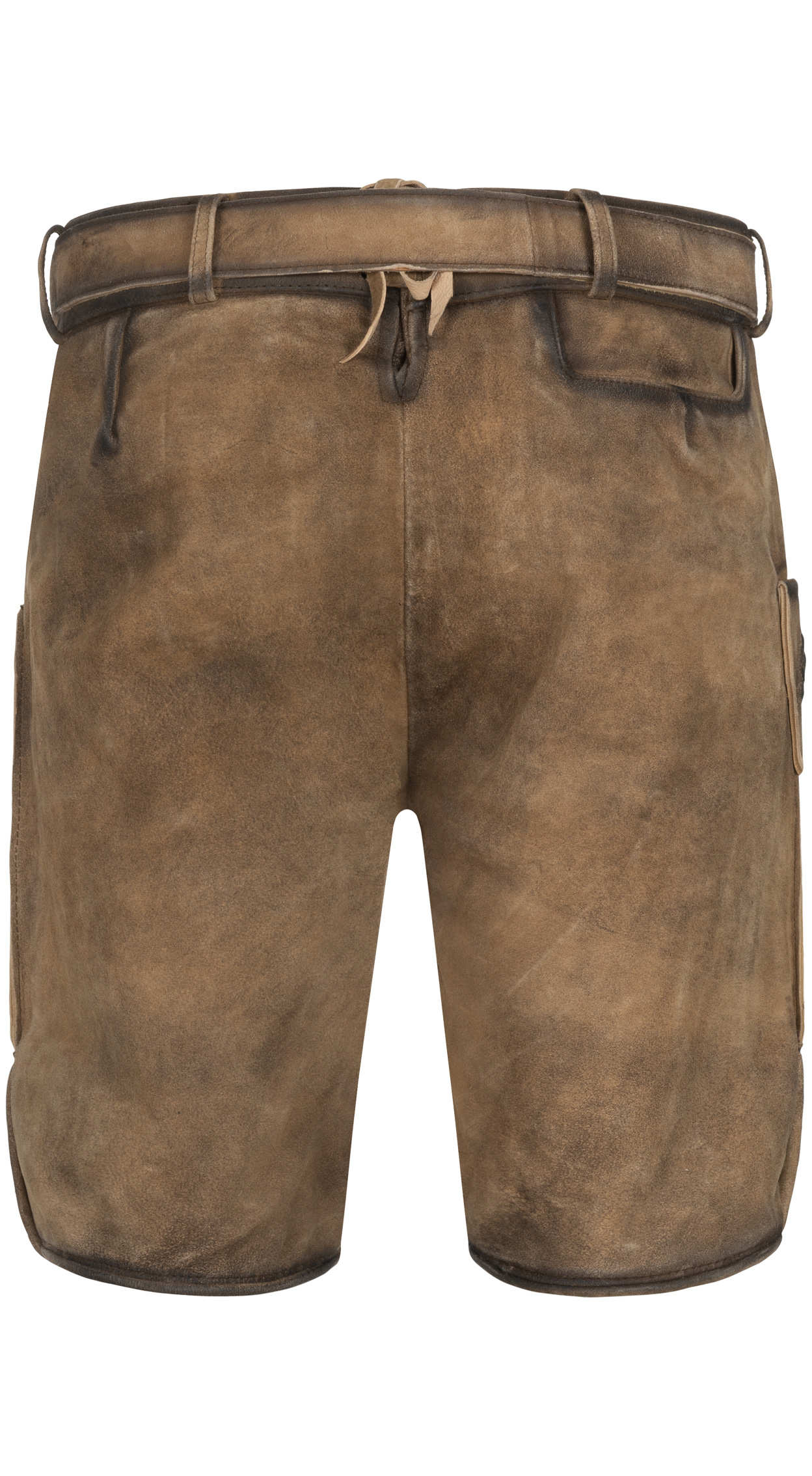 Dann ist diese Lederhose genau das Richtige für Sie! Diese kurze Herren Lederhose in Braun besticht durch ihre aufwendigen Relief Stickereien, die dem Modell einen edlen Charakter verleihen. Die Lederhose ist aus hochwertigem Wildbock Leder gefertigt und hat einen angesagten used Look, der für einen lässigen und authentischen Stil sorgt. Die Lederhose verfügt über zwei Eingriffstaschen, eine kleine Seitentasche auf der rechten Seite sowie eine Gesäßtasche, die Ihnen genügend Stauraum für Ihre persönlichen Gegenstände bieten. Die obligatorische Brotzeitfalte und der Latz zum Aufknöpfen runden das Design ab.