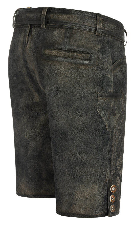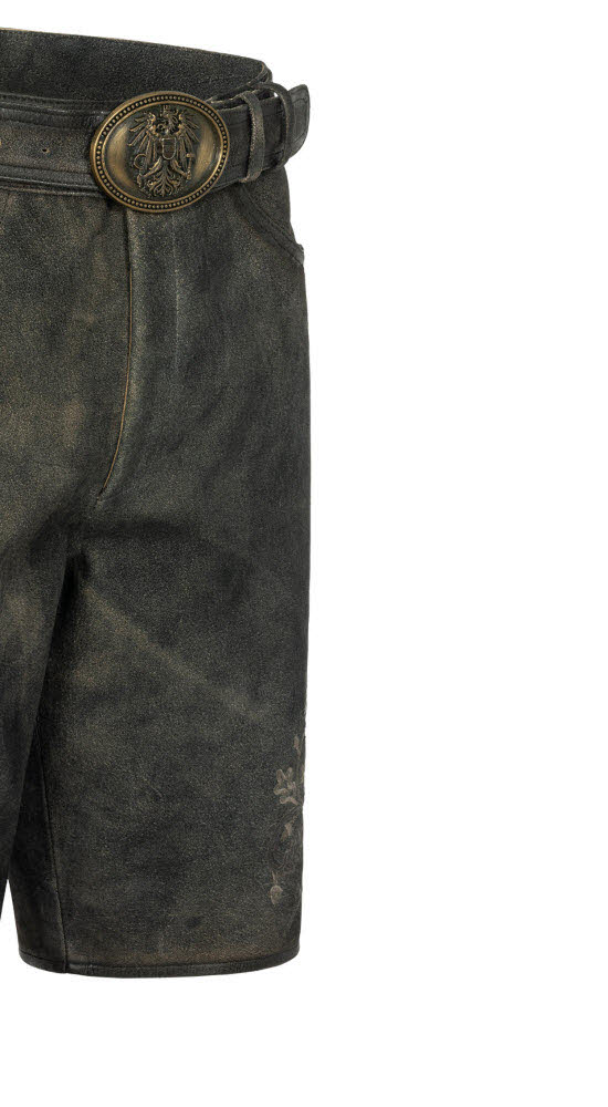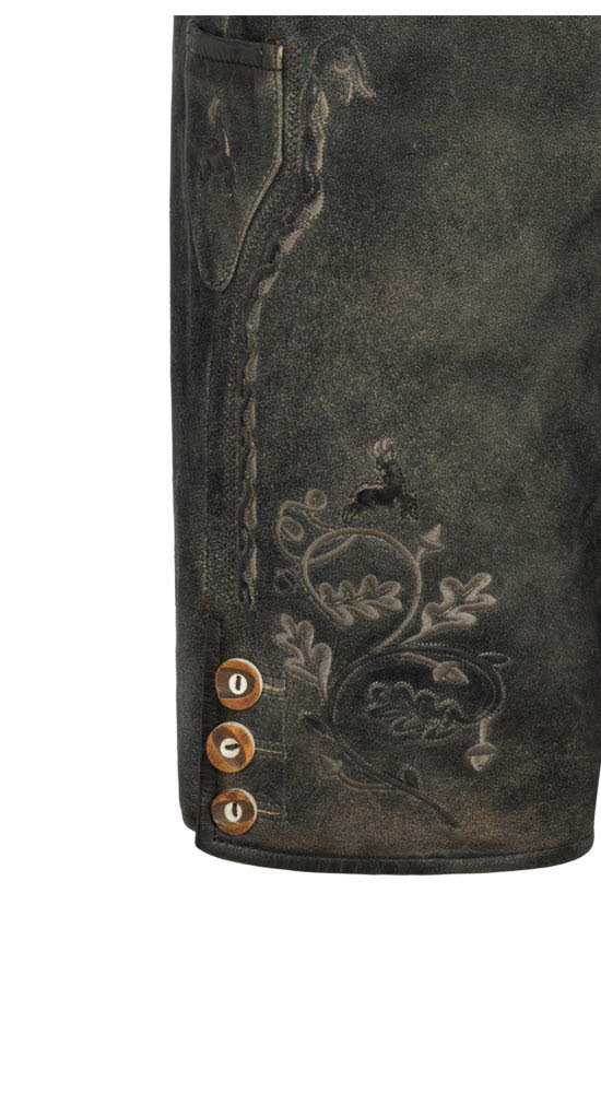 Sie wünschen sich eine Lederhose mit dem gewissen Etwas? Dann ist unsere kurze RV-Lederhose Christian ZIP in Torf von Nübler die richtige Wahl. Diese Hose in der besonderen Farbe Torf ist rustikal einzigartig. Die aufwendigen Reliefstickereien in mehreren Farbtönen verleihen der Hose einen besonderen Vintage-Touch. Die Knöpfe an den Beinabschlüssen sind in heller Hirschhornoptik ein Blickfang. Die Hose verfügt über zwei Eingriffstaschen und eine Gesäßtasche für Ihren Geldbeutel. Rechts am Bein ist ein Messertascherl für Ihr Brotzeitmesser angebracht. Auf der Rückseite befindet sich eine obligatorische Brotzeitfalte, damit Sie die Bundweite regulieren können und auch üppigere Mahlzeiten genießen können. Geschlossen wird die Lederhose durch einen Reißverschluss und einen Knopf. Das absolute Highlight ist der Ledergürtel mit der extravaganten Schnalle. Diese zeigt einen Adler, der vor Stolz nur so strotzt. In dieser traditionellen Lederhose können Sie sich zu jedem Anlass sehen lassen und werden alle Blicke auf sich ziehen.