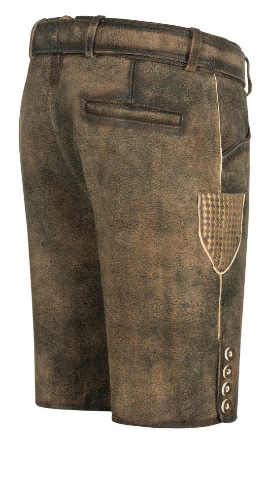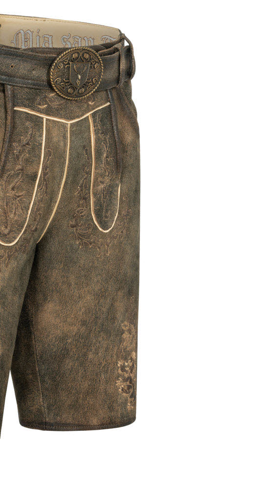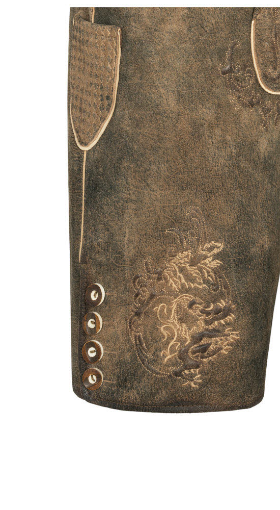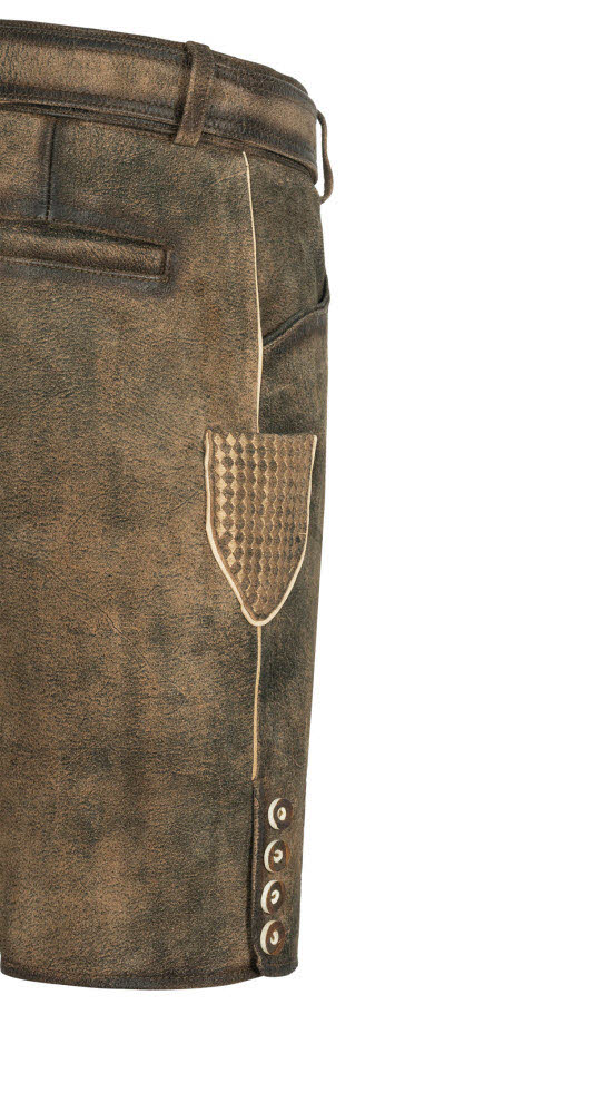 Sie sind auf der Suche nach einer besonderen Lederhose? Dann sind Sie bei unserer kurzen Lederhose Terence in Braun von Nübler genau richtig. Die hochwertig verarbeitete Hose aus weichem und zugleich robustem Leder ist eine Tracht, an der Sie lange Freude haben werden. Die wunderschönen Reliefstickereien sind ein richtiger Hingucker. Auch das Messertascherl rechts am Bein ist auffällig bestickt und ein richtiger Blickfang. Die Knöpfe am Latz und an den Beinabschlüssen sind in Hirschhornoptik gehalten und harmonieren mit den hellen Nähten. Die Lederhose verfügt über zwei Eingriffstaschen und eine Gesäßtasche für Ihren Geldbeutel. Auf der Rückseite ist eine obligatorische Brotzeitfalte angebracht, die der Regulierung der Bundweite dient, damit Sie sich auch nach einer üppigen Mahlzeit wohlfühlen. Der absolute Eyecatcher ist die Schnalle auf dem Ledergürtel. Diese zeigt einen stolzen Hirsch, der für die Verbundenheit mit der Heimat und der Natur steht. Sie werden alle Blicke auf sich ziehen, egal ob auf dem Oktoberfest der einem anderen Anlass.