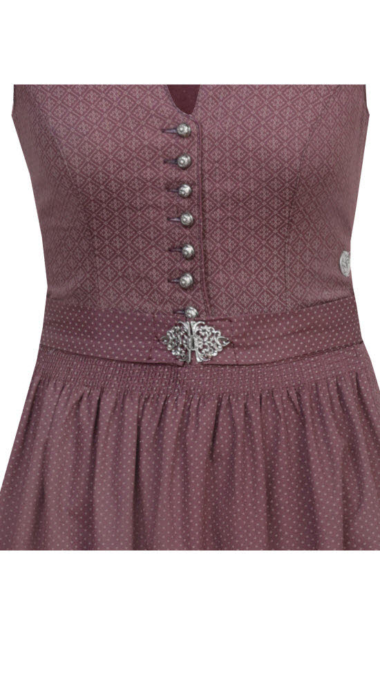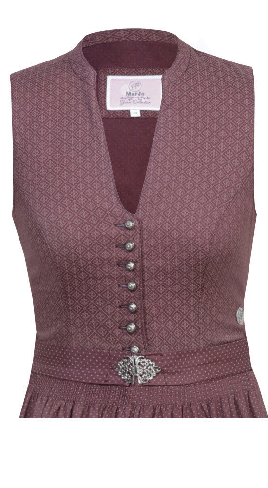 Das Dirndl Karina in Weinrot von Marjo ist einzigartig in seiner schönen filigranen Rautenmusterung. Das Oberteil hat einen V-Ausschnitt und eine wunderschöne Knopfleiste im Altsilberlook. Den Rocksaum schmückt eine Borte im Schürzenmuster. Die Schürze ist gepunktet und wird von einer Borte im Rautenmuster am unteren Ende verziert. Durch eine mit der Knopfleiste harmonierenden Brosche wird das Schürzenband geschlossen und ist ein richtiger Hingucker. Die Reißverschlüsse an den zweiseitigen Eingriffstaschen sorgen dafür, dass Ihre verstauten Kleinigkeiten nicht verloren gehen.