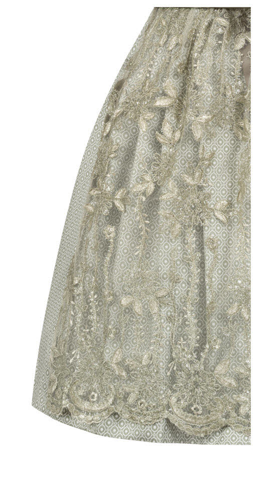 Das Kleid ist mit einem Rauten Muster bedeckt, das typisch für die bayerische Tracht ist. Der Rock hat eine Länge von ca. 55 cm und endet knapp über dem Knie. Das Besondere an diesem mini Dirndl Trachtenmode ist die Netzschürze, die mit Pailletten besetzt ist und einen Schimmer Effekt erzeugt. Die Schürze ist transparent und lässt das Rauten Muster des Rocks durchscheinen. Die Schleife können Sie individuell binden, je nachdem, ob Sie vergeben oder noch zu haben sind.