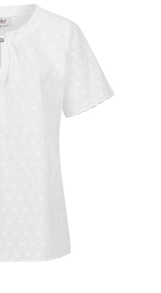 Sie sind auf der Suche nach einer dezenten aber schicken Bluse für jeden Anlass? Dann ist unsere kurzarm Trachtenbluse Sarah in Weiß genau das Richtige. Die Bluse ist durch ihren hohen Baumwollstoffanteil angenehm zu tragen. Die Schlupfbluse wird durch einen funkelnden Perlenknopf auf der Vorderseite geschlossen. So entsteht im Dekolleté-Bereich ein Schlüssellochausschnitt. Abgerundet wird die Bluse durch ihr feines Lochmuster und liebevollen dezenten Stickereien.