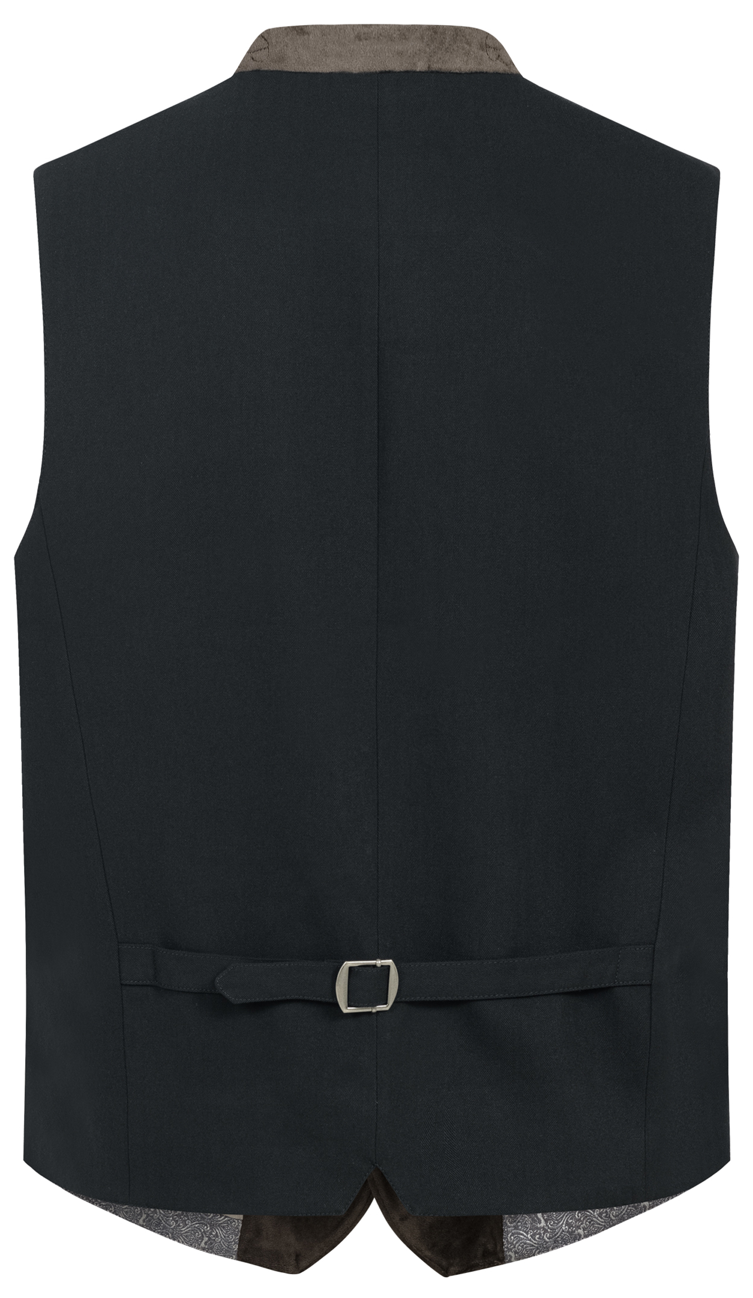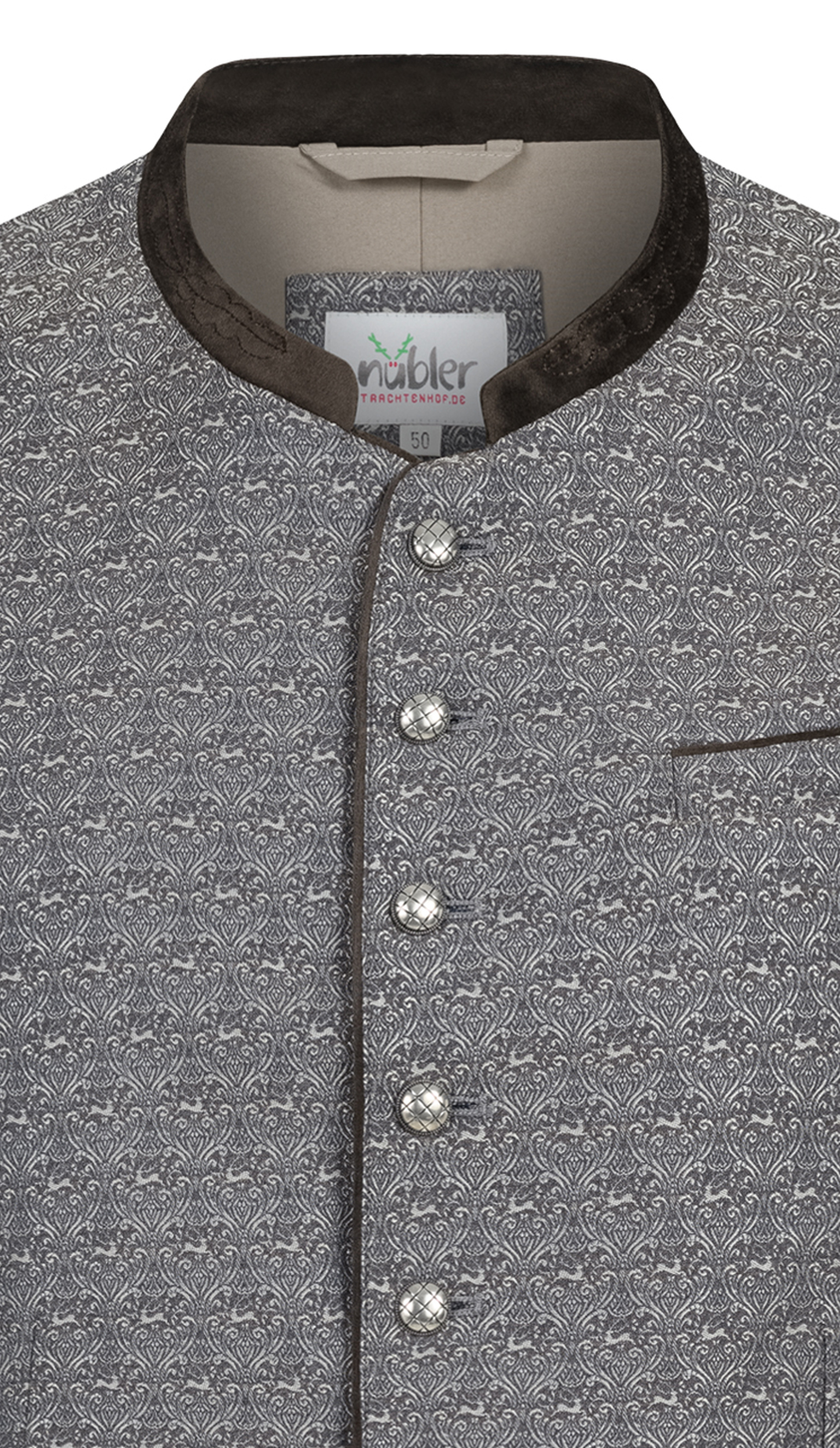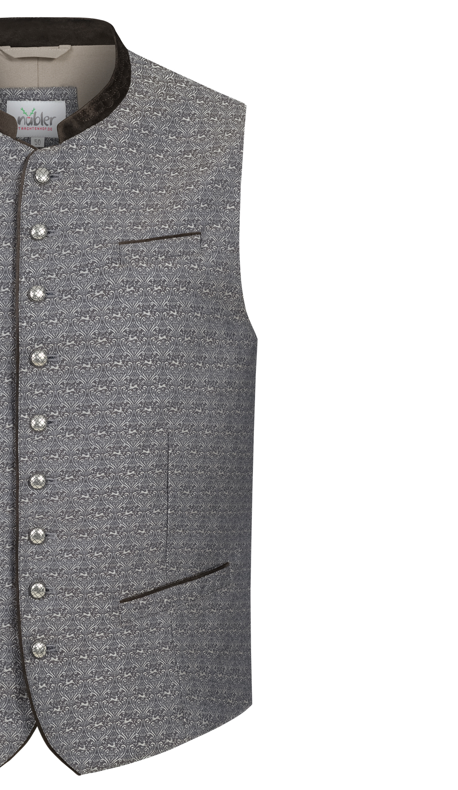 Edle Zurückhaltung trifft auf traditionellen Charme: Das Trachtengilet Walter in Braun-Taupe von Nübler überzeugt mit einem feinen, gleichmäßigen Ornamentenmuster, das dem Vorderteil seine elegante Struktur verleiht. Die Knopfleiste ist mit glänzenden Knöpfen im Altsilber-Look versehen, die das Gesamtbild stilvoll abrunden. Der samtige Stehkragen mit dezenter Stickerei bringt einen festlichen Akzent, während die Brust- und Seitentaschen mit farblich abgestimmten Borten gearbeitet sind und das edle Design vollenden. Auf der schwarzen Rückseite befindet sich ein silberfarbener Rückenriegel zur Weitenregulierung.