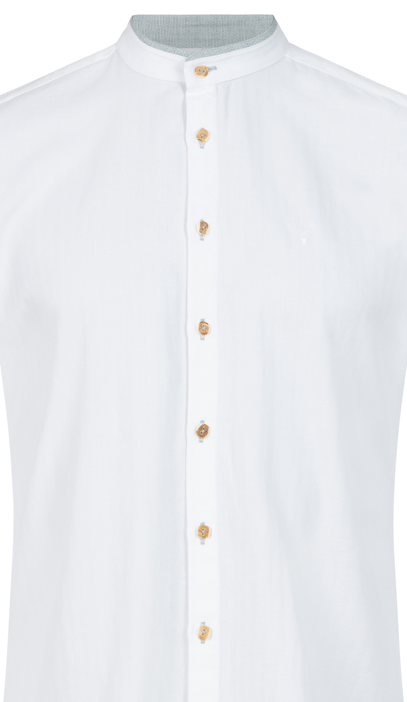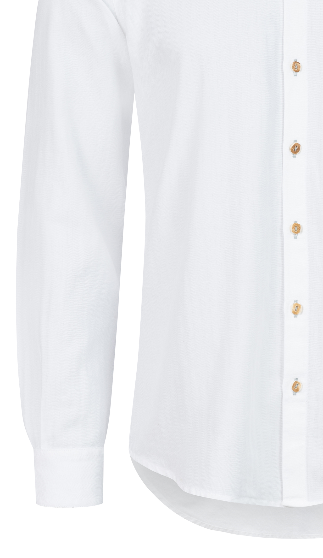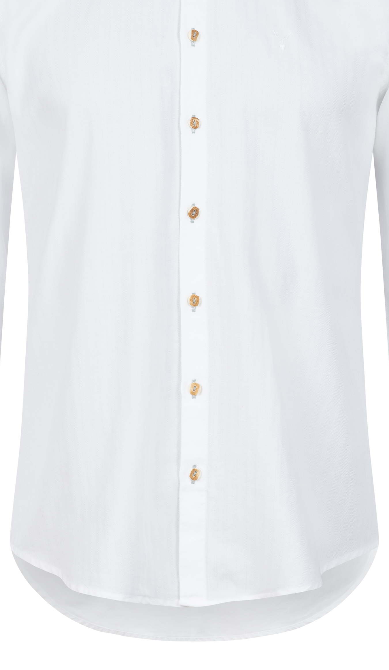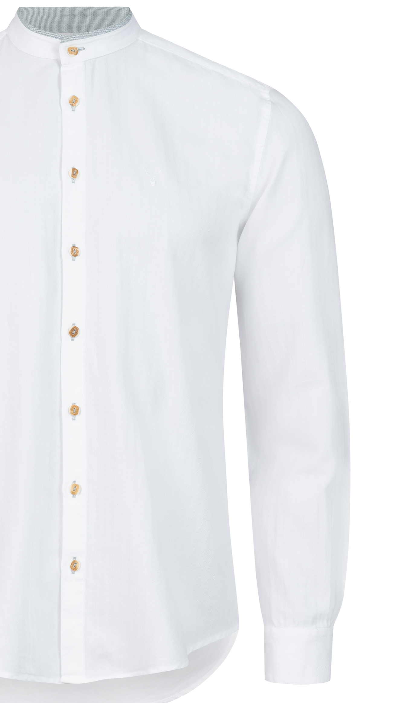 Das weiße Trachtenhemd Paul ist ein einfacher Begleiter, der sich jeder Lederhose perfekt anpasst. Das Hemd ist gerade geschnitten und verfügt über einen Stehkragen. Auf der Vorderseite befindet sich in Brusthöhe eine kleine Hirschkopfstickerei. Die Knöpfe in der Farbe braun-beige sind in einer klassischen Hirschhornoptik gehalten. Die Lochknöpfe wurden mit einem grau-grünen Garn umnäht. Durch den hohen Baumwollanteil ist es sehr angenehm zu tragen. Dieses Trachtenhemd können sie garantiert zu jedem Anlass tragen.