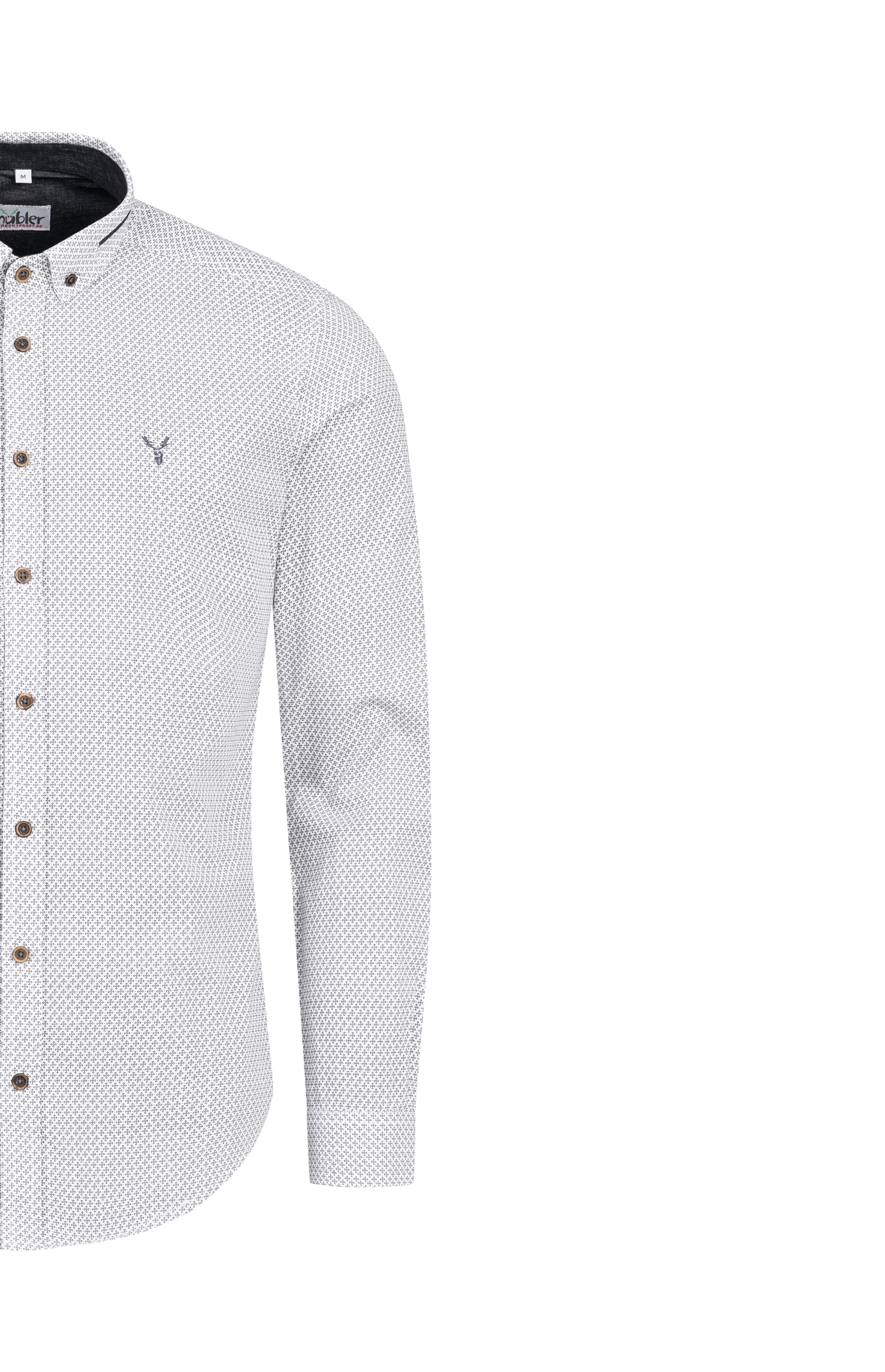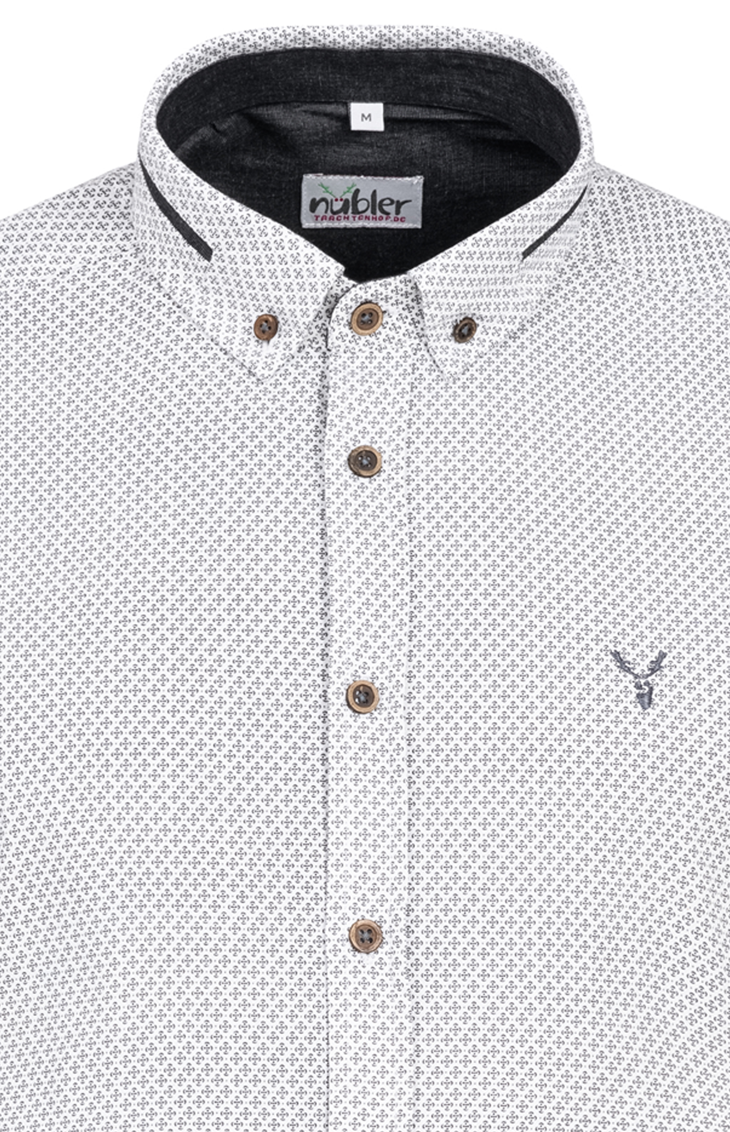 Sie sind auf der Suche nach einem besonderen Hemd für das nächste Oktoberfest? Unser Langarm Trachtenhemd Perez in Schwarz von Nübler ist einzigartig in seiner Musterung. Kleine Rauten und Punkte ergeben ein extravagantes Muster. Auf der linken Brust ist ein kleiner Hirsch aufgestickt, der ein traditionelles Aussehen verleiht. Die Knöpfe in Holzoptik sorgen zusätzlich für einen trachtigen Look. Durch kleine zusätzliche Knöpfe kann der Kragen fixiert werden. Pflegehinweise:30°C Feinwäsche, mit geringer Hitze bügeln. Material:100% Baumwolle